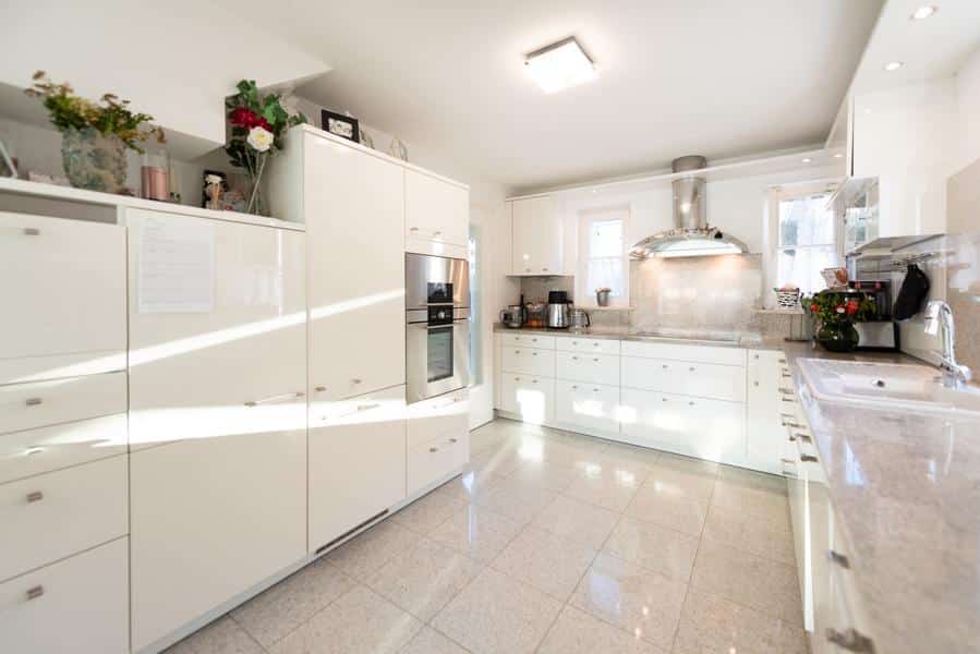 KÜCHE. „Firma Leicht“ mit Geräten, zahlreiche weisse Einbauschränke