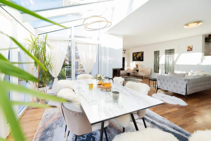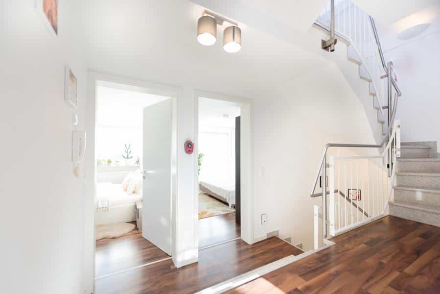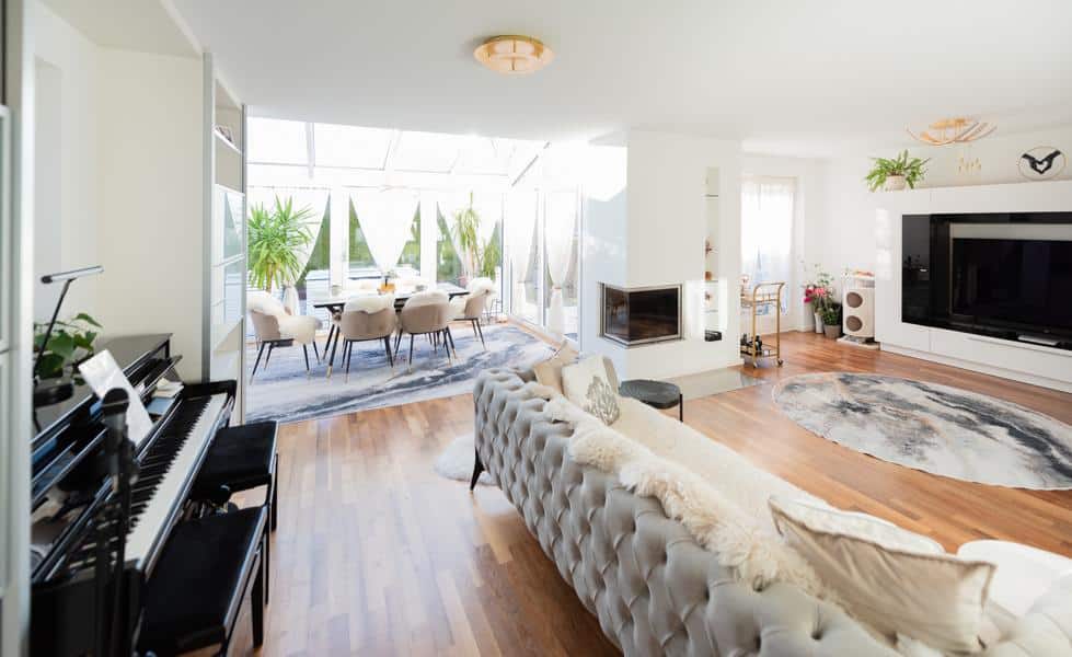 Sechs Zimmer + 2 Zimmer mit Tageslicht im Souterrain, drei Bäder + Wc und ein offenes Wohnkonzept schaffen Raum für gemeinsames Leben – und Rückzugsmöglichkeiten für jeden Einzelnen.