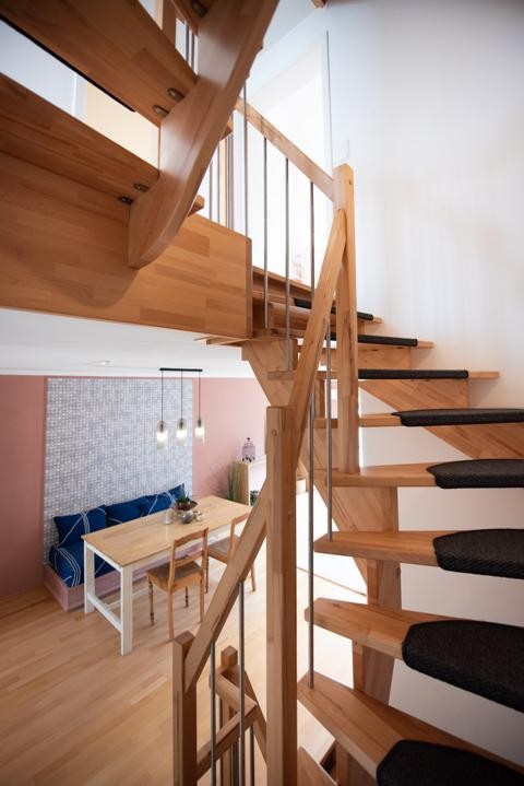*Treppe: massive Vollholztreppe mit senkrechten Holzstäben, Trittstufen in Buche
