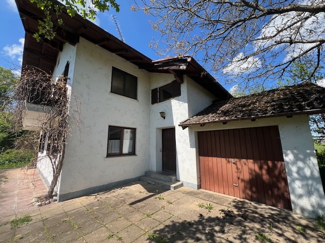 Das Gebäude, das stark sanierungsbedürftig ist, ist teilunterkellert. Es bietet insgesamt vier Zimmer, zwei Küchen, ein separates WC, zwei Speisekammern, zwei Bäder, eine Garage und einen Stellplatz vor der Garage. Das Haus kann entweder als Zweiparteienhaus mit zwei abschließbaren Wohnungen oder als Einfamilienhaus genutzt werden. Es sei darauf hingewiesen, dass das Haus baujahrestypisch ausgestattet ist und unrenoviert verkauft wird. Der Keller weist Feuchtigkeitsstellen an den Innenwänden auf.