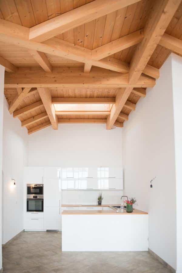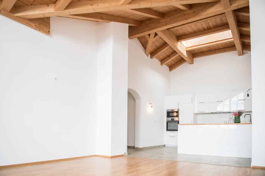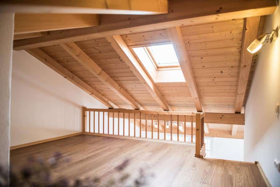 Das Wohnzimmer ist nach Westen mit einem Quergiebel und einer Glasfront versehen, sodass viel Licht in den Wohnraum kommt. Der Westbalkon wird zu jeder Jahreszeit gern genutzt. Durch den offenen Sichtdachstuhl in allen Räumen entsteht insgesamt ein großzügiges Raumambiente.
