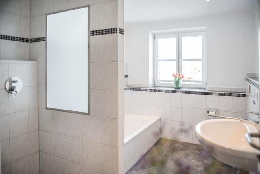 – Bad mit Dusche, Wanne, WC, Waschbecken, Handtuchheizkörper, Fenster